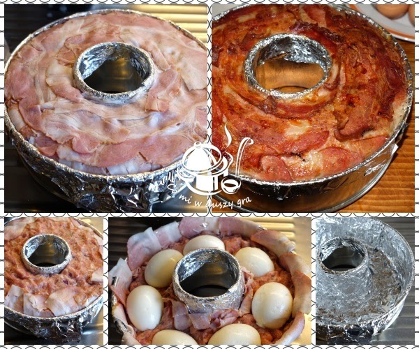 - Formu vystlanú alobalom vystelieme plátkami slaniny. Následne vložíme do formy polovicu mäsovej masy. Na mäsko poukladáme uvarené vajíčka a prikryjeme druhou časťou masy. Viditeľnými plátkami slaniny prikryjeme druhú vrstvu mäsa. Formu párkrát buchneme o stôl aby sa mäso poriadne vo forme uležalo.